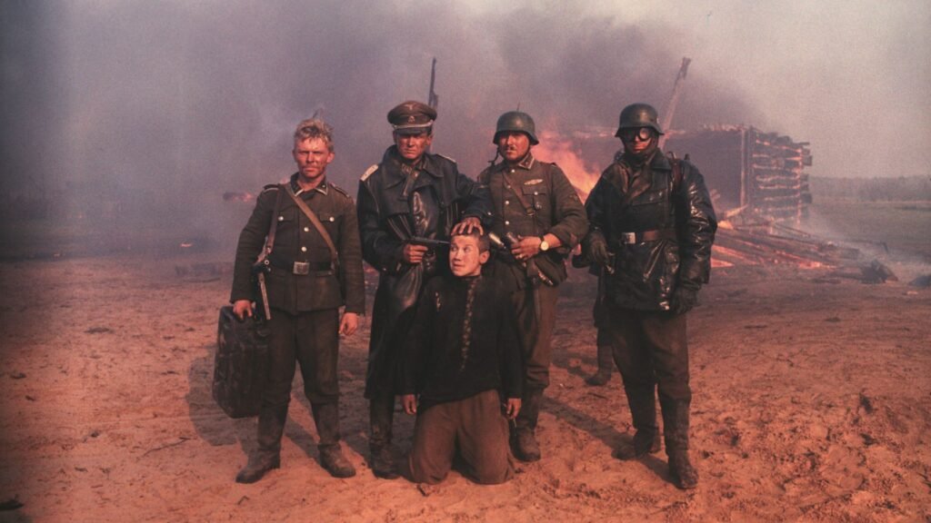 Klimov filmou com munição real algumas de suas cenas. Armas reais. Bombas reais. O terror que vemos nos olhos de Flyora e dos demais atores, muitas vezes é genuíno, porque o set não era uma “zona segura”. E isso não foi um capricho sádico, mas um esforço quase documental de alcançar a verdade da guerra, não com heroísmo, mas com brutalidade e pavor. Imagina como deve ter sido difícil, de grande risco e responsabilidade gravar cenas com armas e munições reais. Parece algo impensável, mas foi feito.